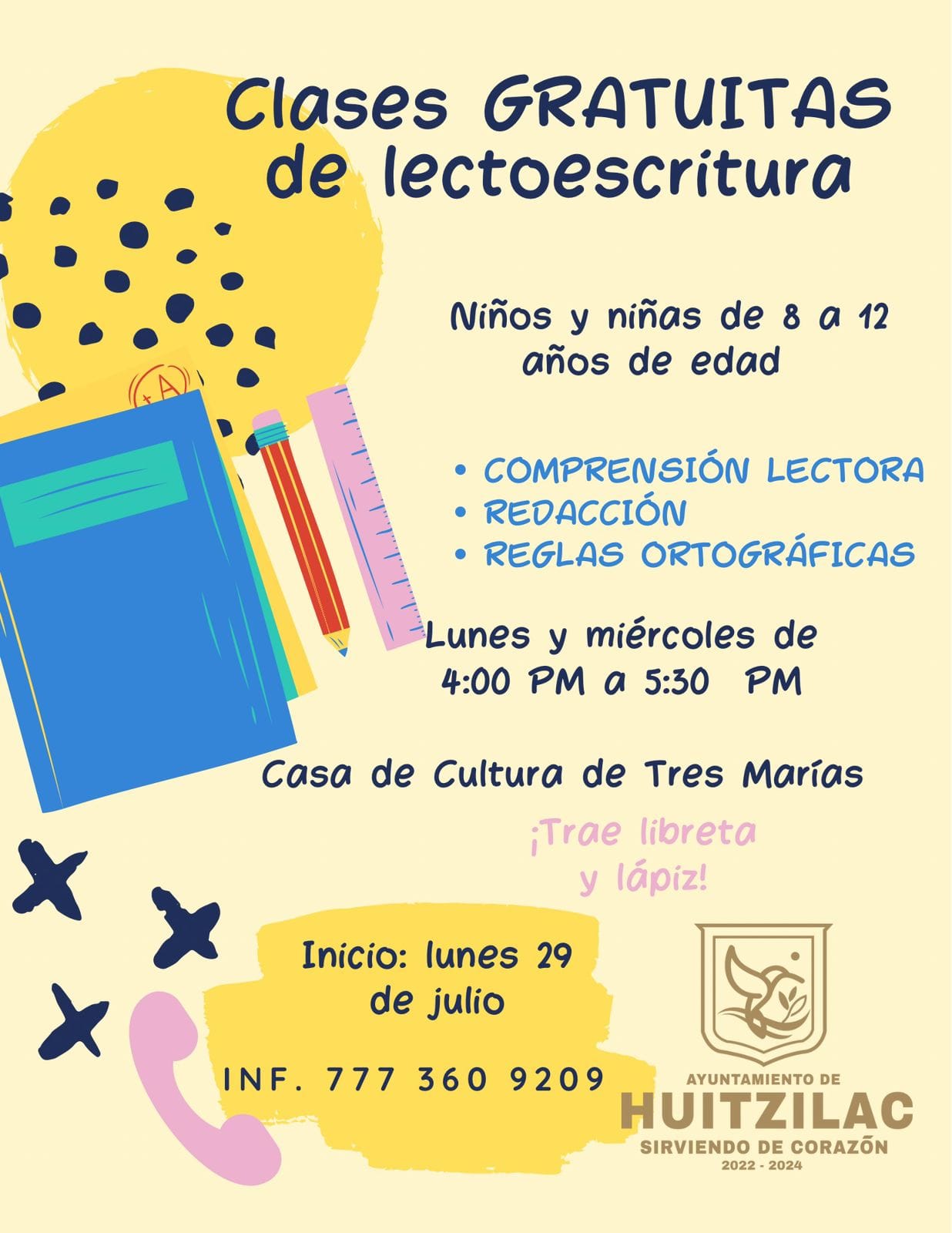 El Ayuntamiento de Huitzilac ha anunciado la apertura de clases gratuitas de lectoescritura para niños y niñas de 8 a 12 años de edad. Estas clases, que se llevarán a cabo en la Casa de Cultura de Tres Marías, están diseñadas para mejorar la comprensión lectora, la redacción y el dominio de las reglas ortográficas de los participantes.