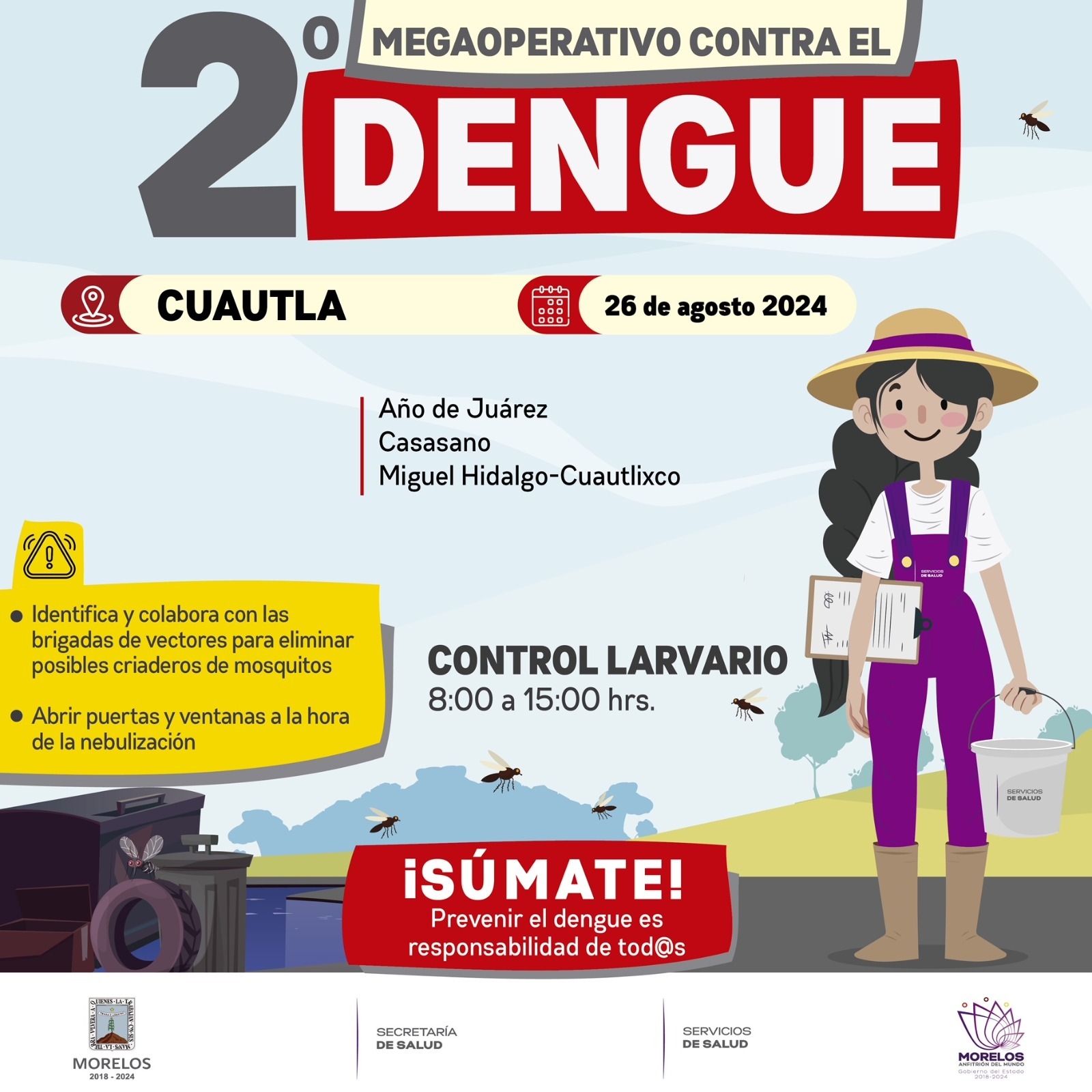 La Secretaría de Salud, a través de Servicios de Salud de Morelos (SSM), informó que se realizará un segundo megaoperativo en el municipio de Cuautla, del 26 al 28 de agosto, para eliminar criaderos de mosquitos que transmiten la enfermedad del dengue, zika y chikungunya.