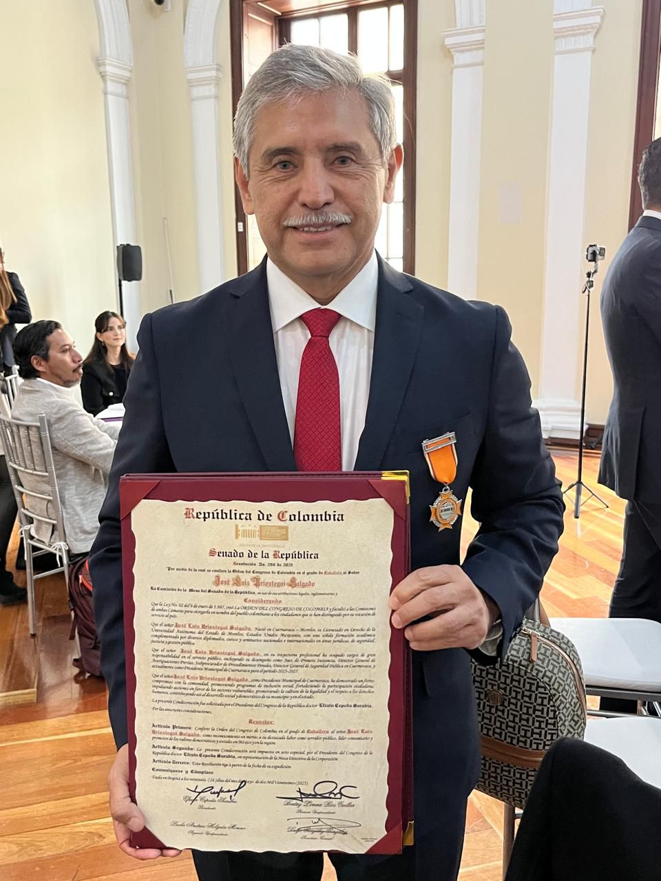 En un acto solemne celebrado en el emblemático Salón de la Constitución del Congreso de la República de Colombia, el presidente municipal de Cuernavaca, José Luis Urióstegui Salgado, recibió la Orden del Congreso de Colombia en el Grado de Caballero, una de las más altas distinciones otorgadas por el Legislativo colombiano en reconocimiento a su destacada trayectoria como servidor público, líder comunitario y firme defensor de la democracia, la libertad y los derechos humanos.