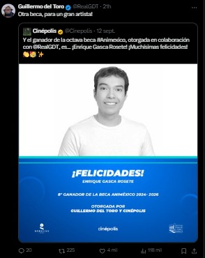 Enrique Gasca Rosete ha sido galardonado con la octava Beca Animéxico, una iniciativa creada por el cineasta Guillermo del Toro y Cinépolis. Gracias a esta beca, Enrique podrá cumplir su sueño de estudiar animación en la prestigiosa escuela Gobelins en París.