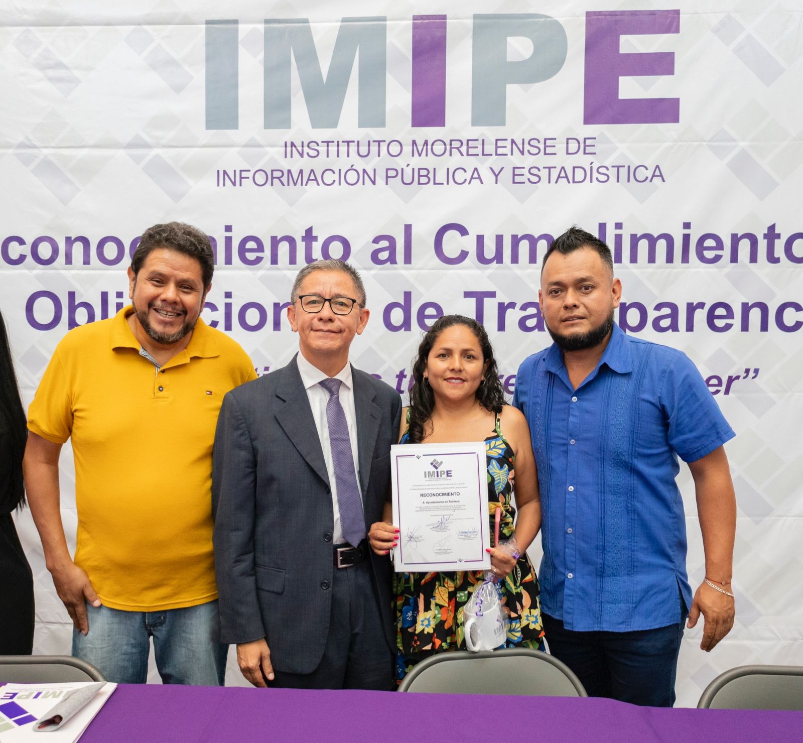 Con el objetivo de garantizar la confianza y participación ciudadana en la gestión pública municipal, el Ayuntamiento de Temixco que preside Juanita Ocampo Domínguez recibió un reconocimiento por su destacado cumplimiento de las obligaciones en la Plataforma Nacional de Transparencia 2023, en su representación acudió el secretario Carlos Caltenco Serrano quién refirió que se trata de un logro importancia en la Rendición de cuentas que hoy queda reflejado en un reconocimiento entregado por el Presidente del Instituto Morelense de Información Pública y Estadística (IMIPE) Hertino Áviles en el museo de la ciudad en Cuernavaca.
